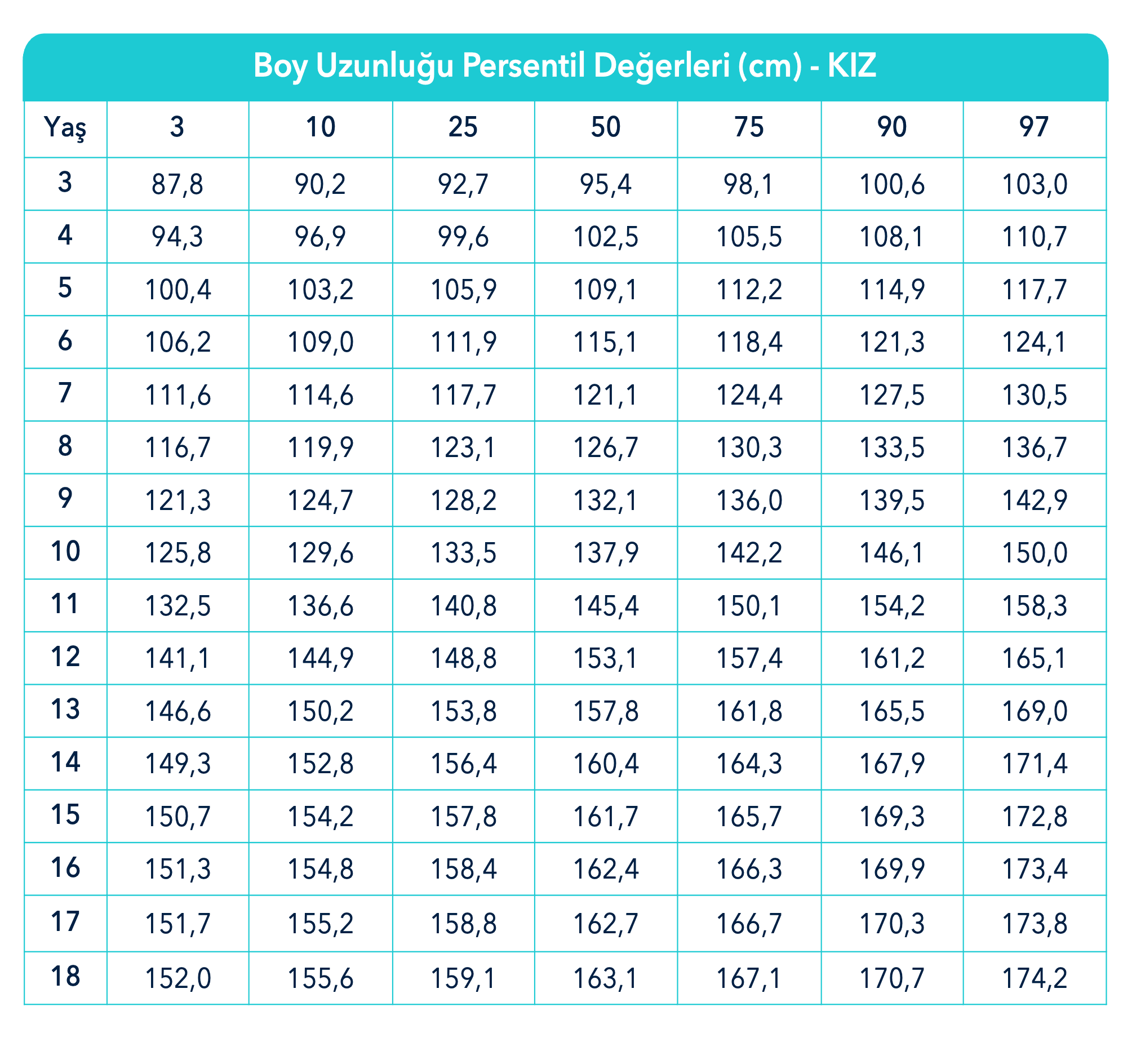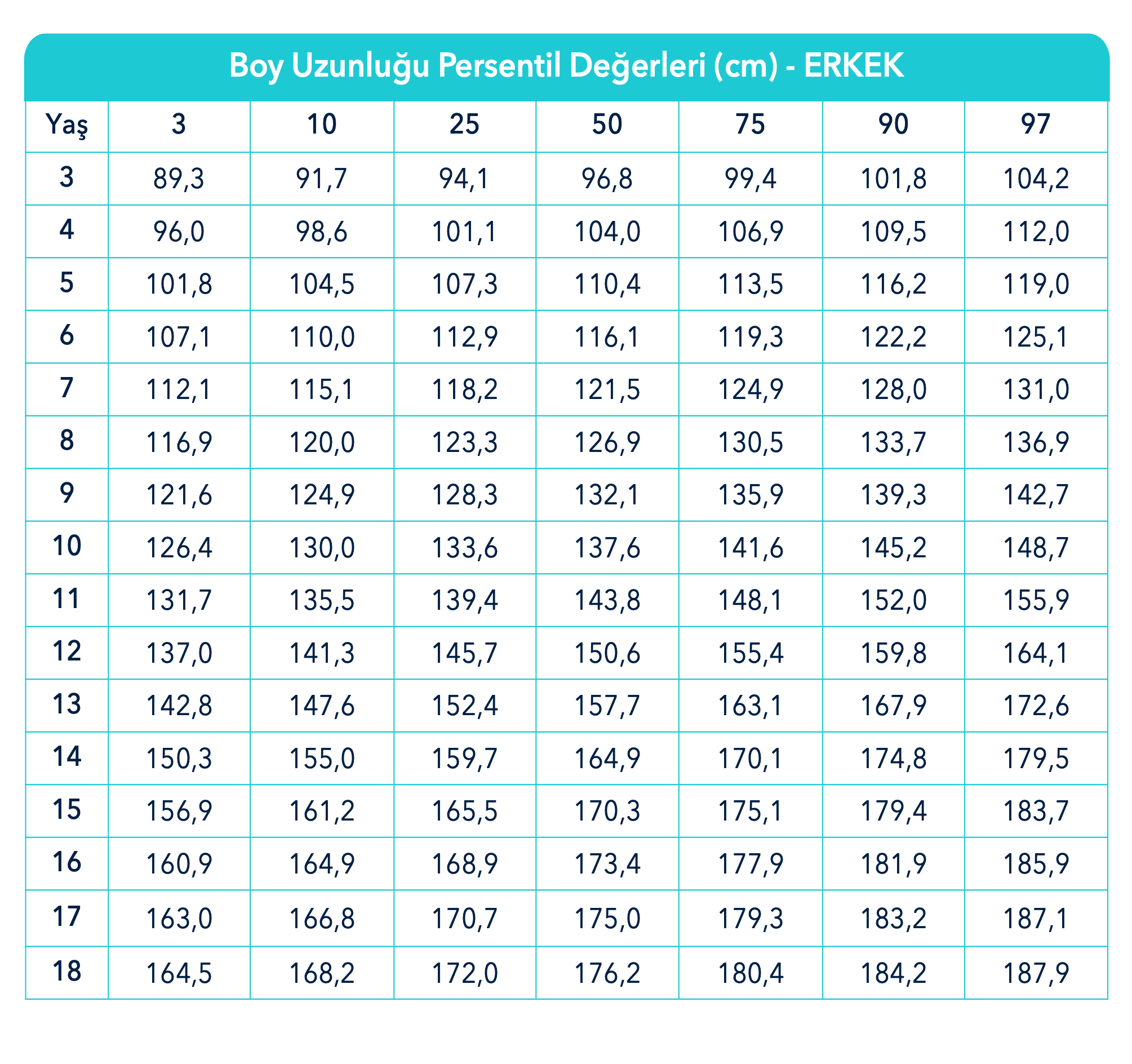 Aşağıdaki tablo Türk çocuklarının boy uzamalarını değerlendirmek için kullanılan referans değerlerdir. 25 ve 75 persentiller arası genellikle normal gelişim olarak kabul edilir. Bununla beraber her çocuğun gelişim hızı farklı olabilir; çocuğunuz yaşıtlarıyla karşılaştırıldığında çok yavaş ya da çok hızlı gelişim gösteriyorsa bu endişe edilecek bir durum değildir. Yine de persentil değerlerine göre çocuğunuz çok kısa (3.persentil) ya da çok uzunsa (97.persentil), fiziksel ve çevresel faktörleri değerlendirmek için doktorunuza danışmanız en iyisidir.