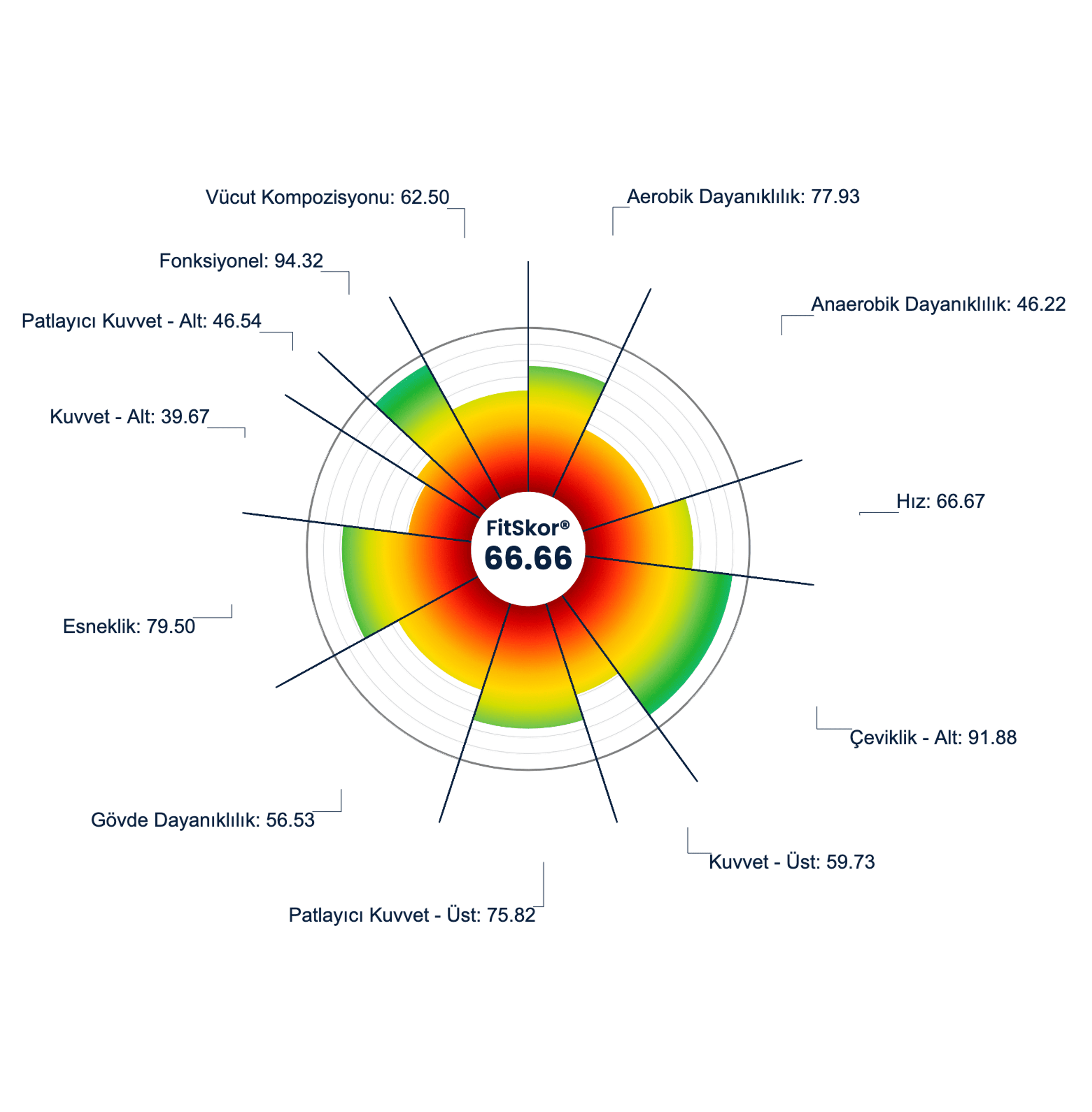 Size tenis sporuna özel Fitness Check-Up protokolü uygulanmış ve fiziksel uygunluk notunuz 66.66 olarak hesaplanmıştır. Bu değerlendirme, tatmin edici bir performansa işaret etmektedir. Mevcut performansınız tenis gerekliliklerini karşılamak için yeterlidir ancak daha üst düzey bir performans için gelişim alanlarınız bulunmaktadır.